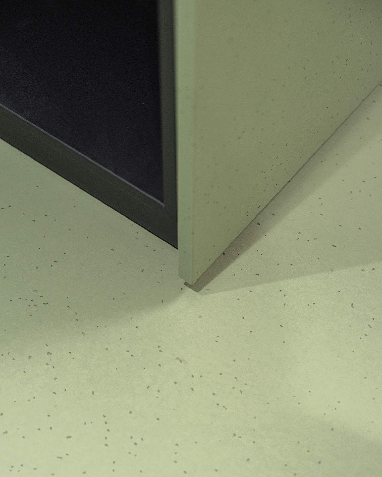Stepping into a space designed with The Nordic Retreat, you are greeted by a perfect balance between modern aesthetics and natural elements. The flooring and reception desk are covered in a contemporary green, patterned linoleum, creating a unique visual cohesion throughout the room. By using the same linoleum for both the floor and reception area, you achieve a seamless, well-thought-out design that enhances the overall aesthetic and showcases the versatility of your interior.